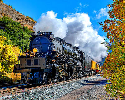 Union Pacific 4-8-8-4 puzzle, based on an original photo by John West (photo copyright John West -- used with permission). Photographed at Morgan, Utah, October 1, 2019.