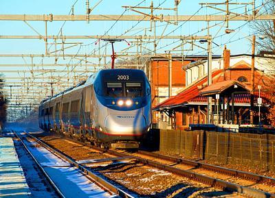 Amtrak Acela Express Trainset puzzle, based on an original photo by Sean McPherson (photo copyright Sean McPherson -- used with permission). Photographed at Attleboro, Massachusetts, January 1, 2018.