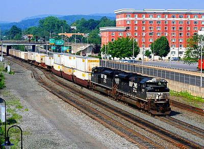 Norfolk Southern SD70M-2 puzzle, based on an original photo by Stephen Bradley (photo copyright Stephen Bradley -- used with permission). Photographed at Altoona, Pennsylvania, July 12, 2008.