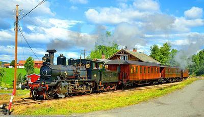 Krøderbanen 2-6-0 puzzle, based on an original photo by Reinhard Reiss (photo copyright Reinhard Reiss -- used with permission). Photographed at Snarum, Norway, July 9, 2022.