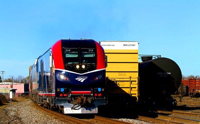 AMTRAK ALC-42 puzzle, based on an original photo by Joel Hawthorn (photo copyright Joel Hawthorn -- used with permission). Photographed at Albany, Oregon, March 15, 2024.