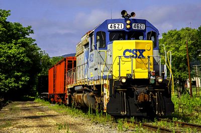 CSX Transportation (CSXT) SD40 puzzle, based on an original photo by Matt Thomas (photo copyright Matt Thomas -- used with permission). Photographed at Ridgley, West Virginia, June 29, 2025.